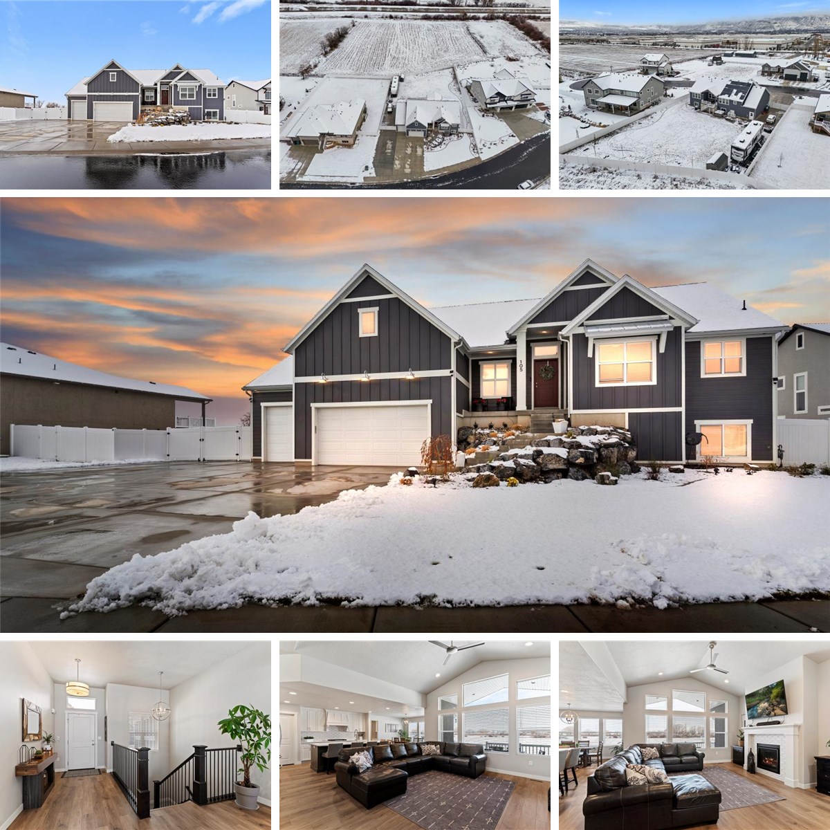 Better-than-new farmhouse rambler on nearly a ½-acre lot with RV parking, a fully finished basement, and the landscaping already completed. Ideally located on a dead-end street with no backyard neighbors and open farmland behind, offering privacy and unobstructed views. This spacious, open-concept home features tall ceilings, a vaulted great room, large windows for abundant natural light, LVP flooring, and a cozy tiled fireplace. The fully finished basement includes a separate entrance and is plumbed for a future kitchenette, plus additional family space with three total family rooms, including a rec room and media rooms. The gourmet kitchen boasts a 10' x 4' island, white shaker cabinets, upgraded quartz countertops, tile backsplash, composite granite sink, gas range, stainless steel appliances, a huge pantry, and a large dining room space. Luxurious main-level primary suite features a tray ceiling, walk-in closet, double vanity with quartz countertops, and a separate soaking tub and shower with quartz surrounds. Exceptional parking and storage include a 4-car extra-tall, extra-deep garage with storage loft, utility sink with hot and cold water, two 220 outlets in the garage, gated RV pad, 120' x 20' RV parking area, and an additional 220 outlet in the backyard for an RV or hot tub. Functional mudroom, drop zone, and half bath connect directly from the garage. The fully fenced and landscaped yard offers a large covered Trex deck, a large 16' x 30' cement patio, and additional gravel area ideal for additional trailer parking or a firepit. Additional upgrades include window coverings, tinted south-facing windows, wrought-iron stair railing, taller basement ceilings, a massive cold storage room under the back back deck (accessed through the closet Murphy door), and solar panels included. Patio door has a custom doggy door insert and will be replaced with a standard door with window prior to closing.