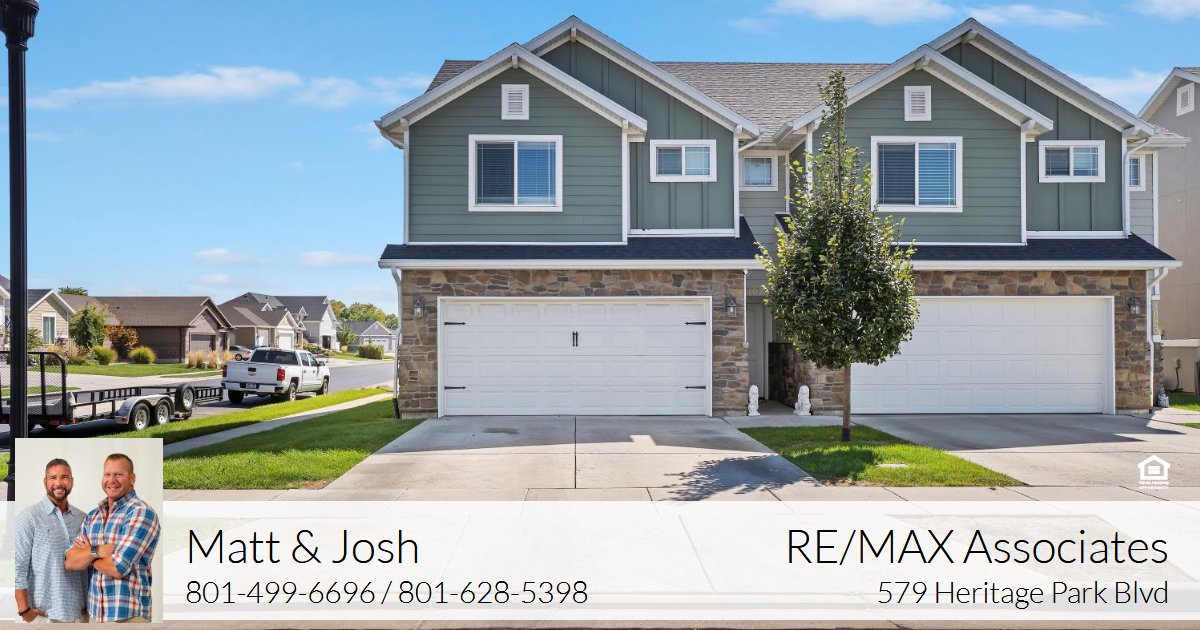 Picture Perfect town home featuring a handsome exterior of stone, board-n-batten and stucco. Interior features great room with carpet and tile flooring, large windows for lots of natural light, kitchen has smooth-top range / granite counters / refrigerator (included!) / rich dark-stained cabinets, large dining area and half bath complete the main level. Upstairs has French doors into the primary bedroom with custom accent wall / full bath having two sinks / separate tub and over-sized shower / decorative archway into the walk-in closet, 2 additional bedrooms, 1 full bath and laundry complete the upper level. Exterior has private patio area, 2-car garage, on desirable corner lot location. For more information call Josh or Matt at 801-628-3733. To view all homes visit www.AllHouseValues.com. Re/Max Associates
