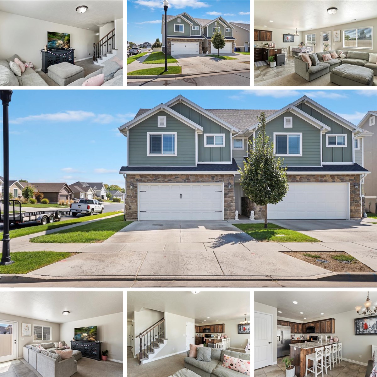 Picture Perfect town home featuring a handsome exterior of stone, board-n-batten and stucco. Interior features great room with carpet and tile flooring, large windows for lots of natural light, kitchen has smooth-top range / granite counters / refrigerator (included!) / rich dark-stained cabinets, large dining area and half bath complete the main level. Upstairs has French doors into the primary bedroom with custom accent wall / full bath having two sinks / separate tub and over-sized shower / decorative archway into the walk-in closet, 2 additional bedrooms, 1 full bath and laundry complete the upper level. Exterior has private patio area, 2-car garage, on desirable corner lot location. For more information call Josh or Matt at 801-628-3733. To view all homes visit www.AllHouseValues.com. Re/Max Associates