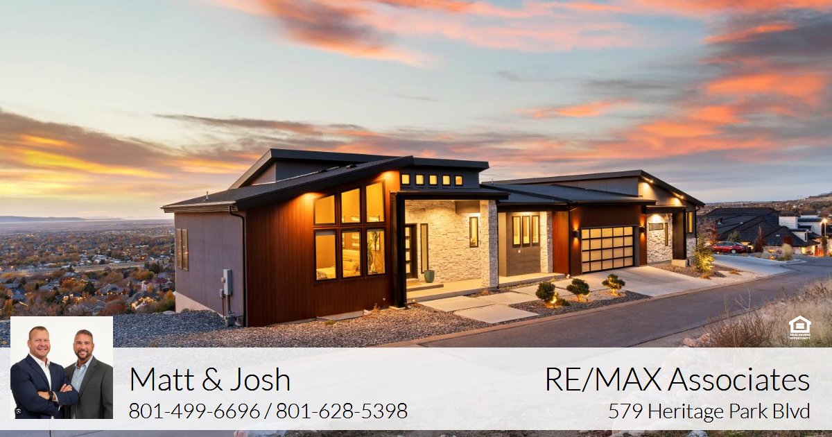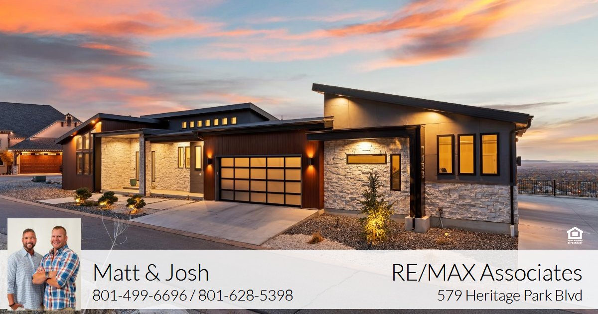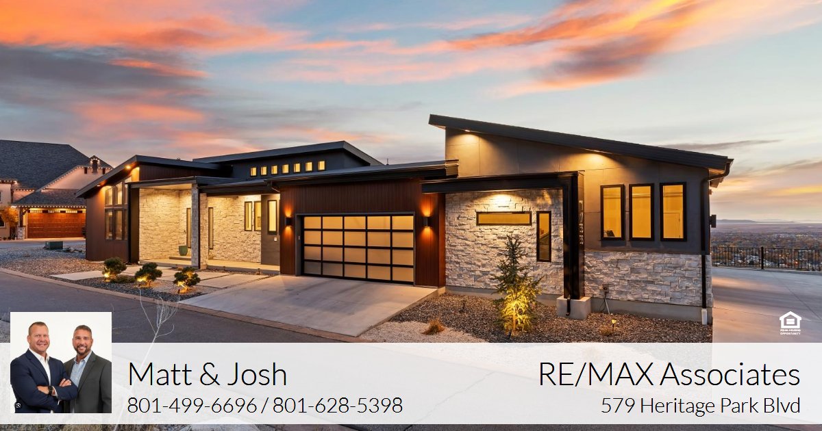 hood / tile backsplash / side-by-side refrigerator / center island with pendant lighting, plus additional refrigerator in the large walk-in butlers pantry, large open dining area. Double sliding glass doors lead to the full length epoxy coated covered deck with outdoor kitchen, romantic views, glass railings, fireplace and spiral staircase leading to lower patio. Primary bedroom with en-suite having marble floors, free standing soaking tub, marble shower, huge walk-in closet. Split floor plan with guest bedroom with walk-in closet and 3/4 bath. Laundry/mudroom complete the main level. Suspended staircase with glass railings lead to the lower level featuring generous family room, 2 bedrooms and 1 full bath plus additional laundry room. Lots of potential for the 1,104 sq ft under the suspended garage! Full length lower level covered patio too! Extensive 4- car garage, wired for 220, with glass garage doors. Home has $25,000 fire suppression system plus 19 caisson piers were installed for earthquake proofing costing $240,000. Owner open to including any/all furnishings, and will include 4-wheeler with snow plow. The Hidden Springs community enhances your lifestyle with a clubhouse having a full kitchen, pool and hot tub, workout facility, and walking trails, all within close proximity to high-rated schools, Station Park Shopping Center, parks, and outdoor activities. Plus, with easy access to freeways and just 20 minutes to ski resorts and Salt Lake International Airport, convenience is at your fingertips. Owner/agent. For more information call Matt at 801-628-3733. To view all homes visit www.AllHouseValues.com. Re/Max Associates"