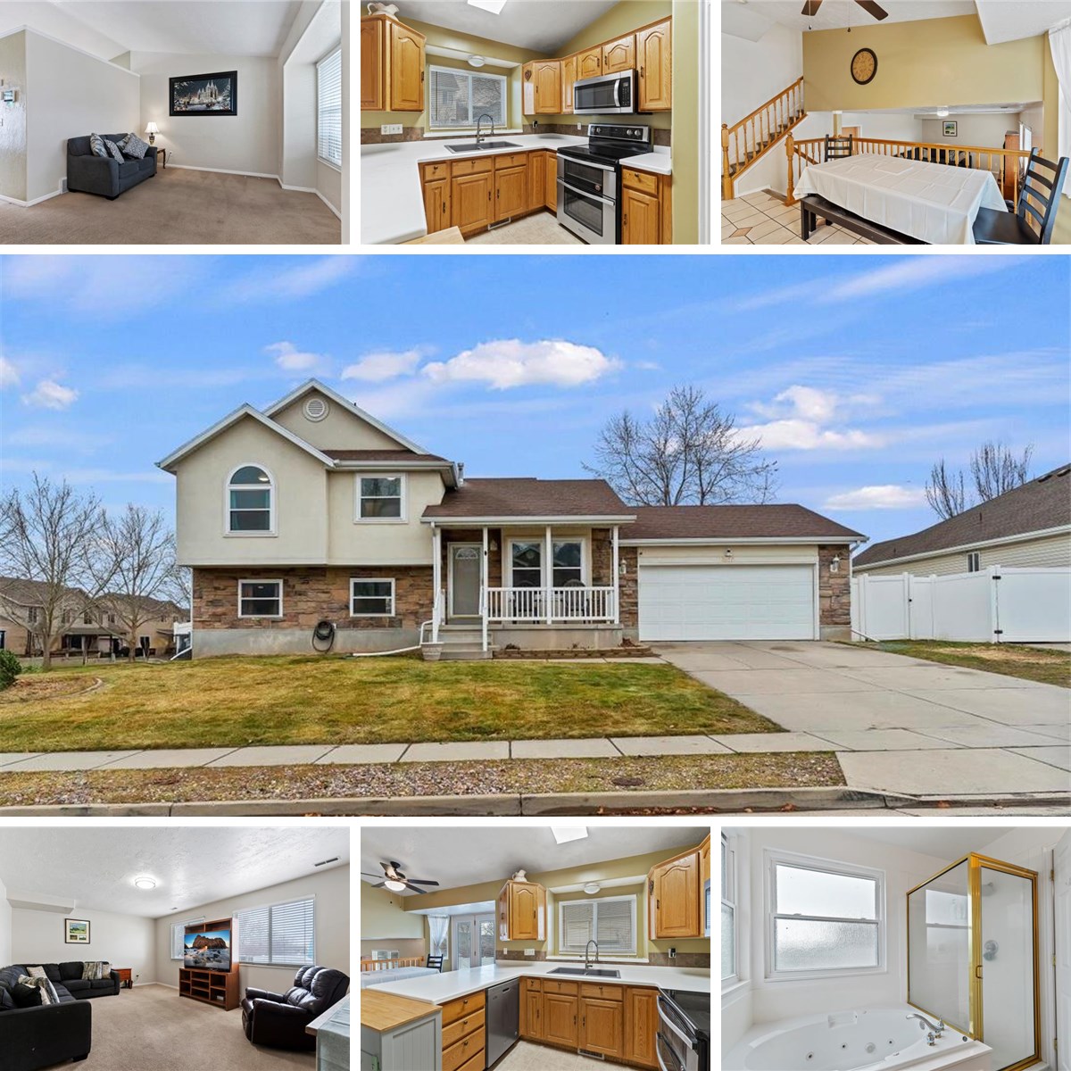 Located in a great part of Layton with quick access to I-15, Highway 89, Hill AFB, Sam's Club, and Northridge, this spacious home offers an ideal blend of comfort, updates, and convenience. Featuring 5 bedrooms and 3 bathrooms, this floor plan includes an extra bedroom rare for a tri-level home. Updated kitchen showcases Corian countertops, composite granite sink (2021), and newer dishwasher & microwave (2021), and sellers will be installing LVP flooring in the kitchen. The primary suite includes a dedicated mini-split system (new 2019) for personalized comfort, and the bathroom features a large jetted tub, separate shower, and vanity with cultured marble surround. Major system updates include new water heater (2022), new furnace and A/C (2019/2020), roof replaced in 2006, and all new energy-efficient vinyl windows (2023), including replaced east-facing upper windows for enhanced efficiency and natural light. Additional highlights include fiber internet availability, well-insulated cold storage, fully fenced and landscaped 0.19-acre lot with vinyl fencing, and a large backyard cement pad ideal for entertaining. Sellers will also be replacing the carpet in the basement bedroom and on the stairs. Relax on the comfortable covered front porch and enjoy shaded evenings in this established Layton neighborhood close to schools, shopping, dining, & outdoor recreation!