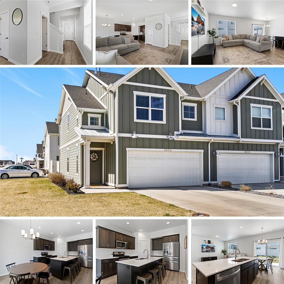 Located in the highly desirable Green Farms community, this nearly new end-unit townhome offers exceptional natural light with additional windows, 9-foot ceilings, and an open, spacious layout designed for modern living. Residents enjoy access to pickleball courts, miles of walking trails, and a community center, enhancing both lifestyle and long-term value. This clean, move-in ready home features durable LVP flooring throughout the main level, a convenient half bath, large open spaces perfect for gathering, and a dining area that comfortably fits a full-size table. The kitchen is thoughtfully designed with quartz countertops, stained cabinetry, stainless steel appliances, a gas range, double basin sink, pantry with ample storage, a convenient electronic drop zone, a brand new dishwasher (2026), and a huge island that can seat up to four people. The upstairs floor plan is uniquely designed to create separation and privacy for the owner’s suite while maintaining proximity to the additional bedrooms, offering the ideal balance of function and comfort. The owner’s suite includes a spacious bedroom with room for a king-size bed and nightstands, a large walk-in closet, and an ensuite bathroom featuring an extended double vanity with quartz countertops, a shower/tub with cultured marble surround, and a separate toilet room. The secondary bathroom also includes a tub/shower combo and upgraded quartz countertops. Additional highlights include an extra-deep 2-car garage that accommodates a full-size truck, a larger laundry room with a window providing abundant natural light conveniently located on the same level as the bedrooms, and an additional upstairs utility storage room not commonly found in townhomes. Exterior features include craftsman designer finishes, cement board siding, and a large patio extending the full length of the townhome that opens to community green space. The townhome's backyard patio space has the potential to be fenced.